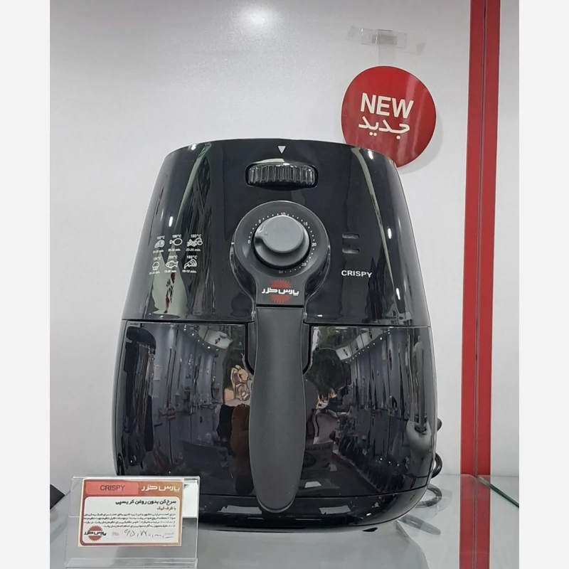 سرخ کن بدون روغن کریسپی CRISPY - ظرف فلزی با روکش نچسب (تفلون) و جداره پلاستیکی تزئینی در قسمت جلوی ظرف. (دارای محل نصب و قفل دستگیره سبد).- ظرفیت ظرف فلزی: 4.7 لیتر.-طراحی کف ظرف به صورت حلقه ای در راستای بهبود فرآیند گردش هوا.- سبد سرخ کن با روکش نچسب (تفلون) مشکی.- مجهز به روکش ایمنی برای قفل سبد.